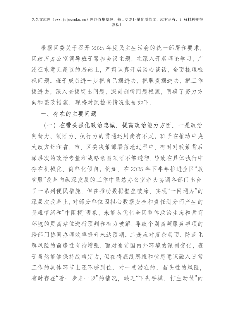 政府办公室领导班子2025年度民主生活会对照检查材料(五个带头)