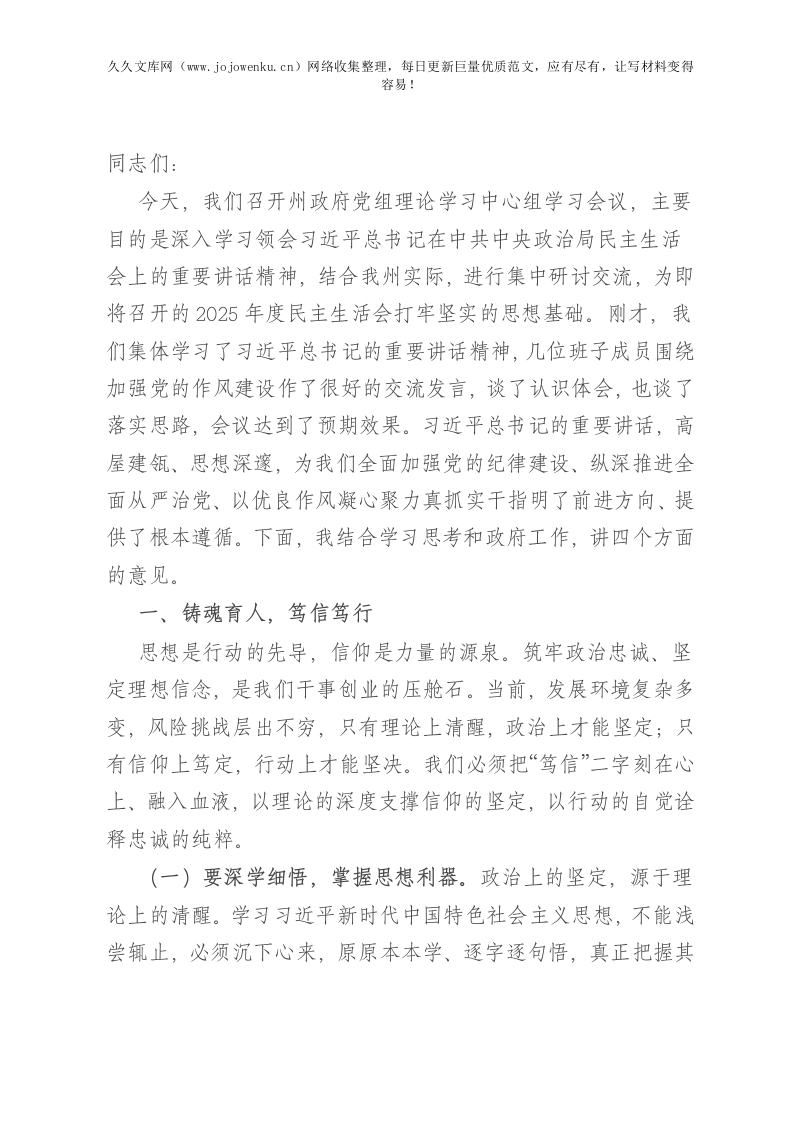 州长主持政府党组理论学习中心组学习会议暨2025年民主生活会会前研讨发言时的讲话