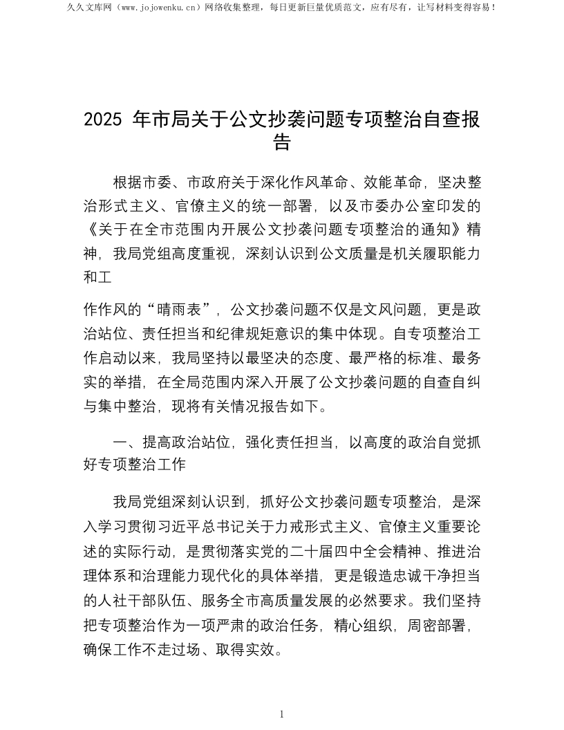 2025年市局关于公文抄袭问题专项整治自查报告