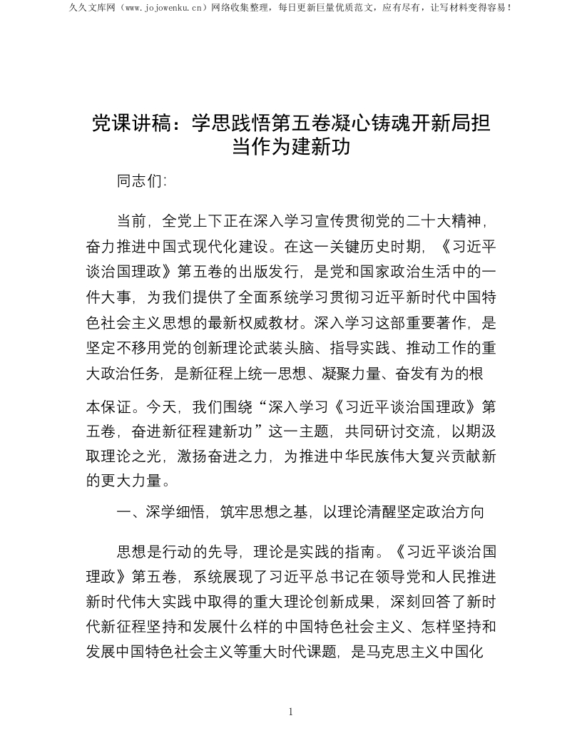 党课讲稿:学思践悟第五卷 凝心铸魂开新局 担当作为建新功