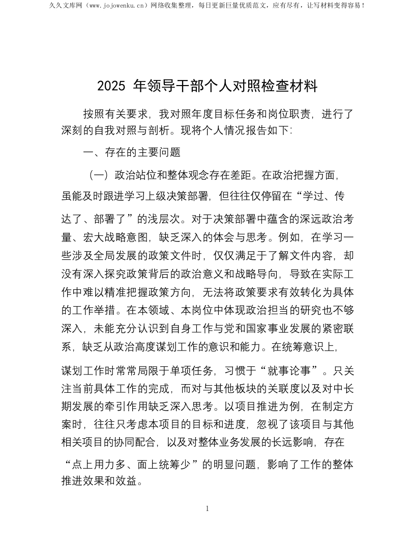 2025年领导干部个人对照检查材料