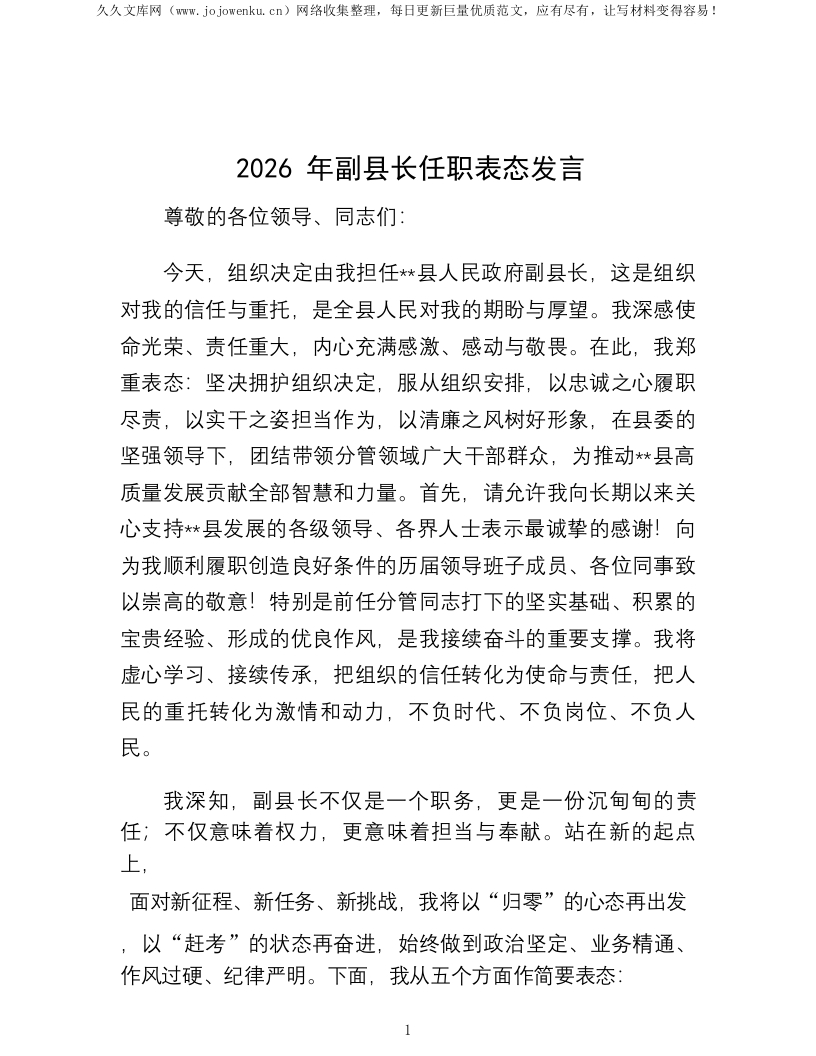 2026年副县长任职表态发言
