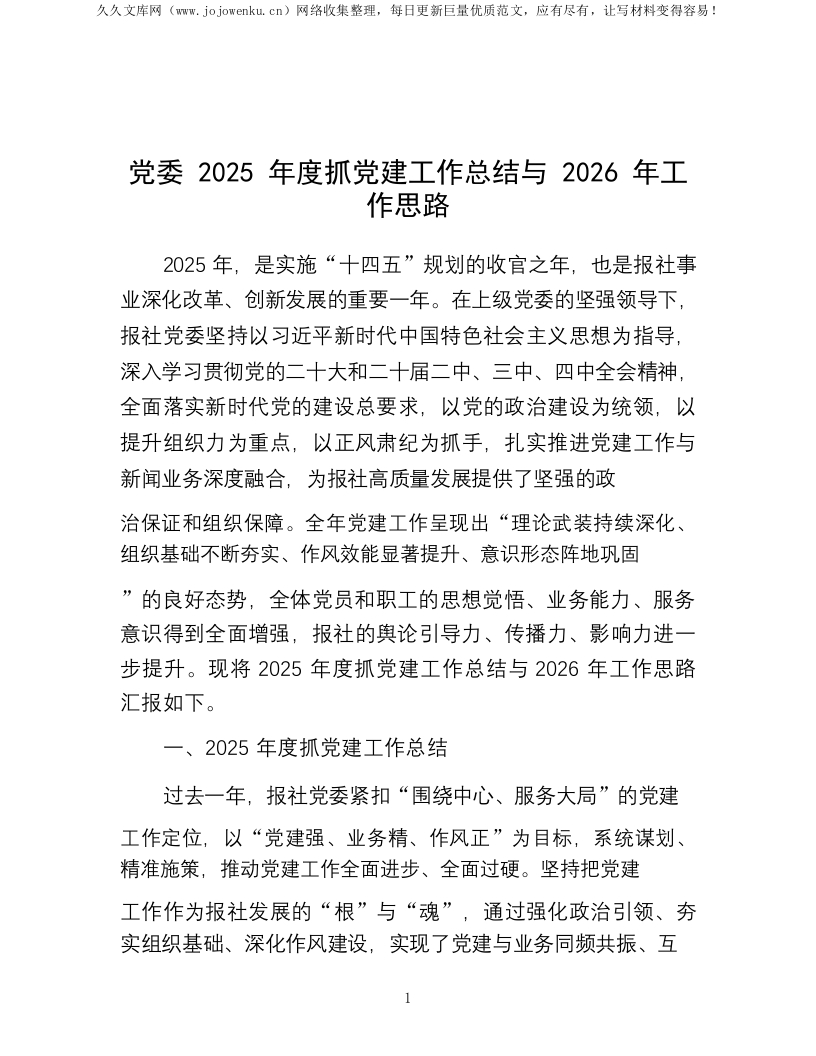 党委2025年度抓党建工作总结与2026年工作思路