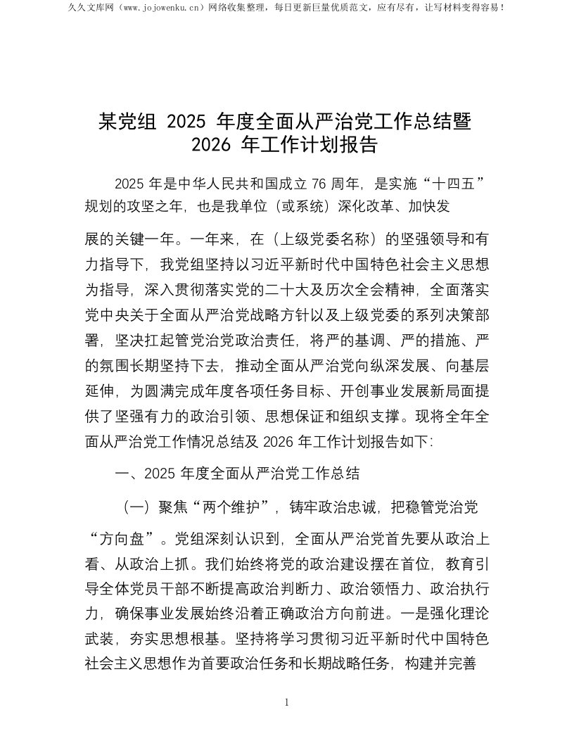 某党组2025年度全面从严治党工作总结暨2026年工作计划报告