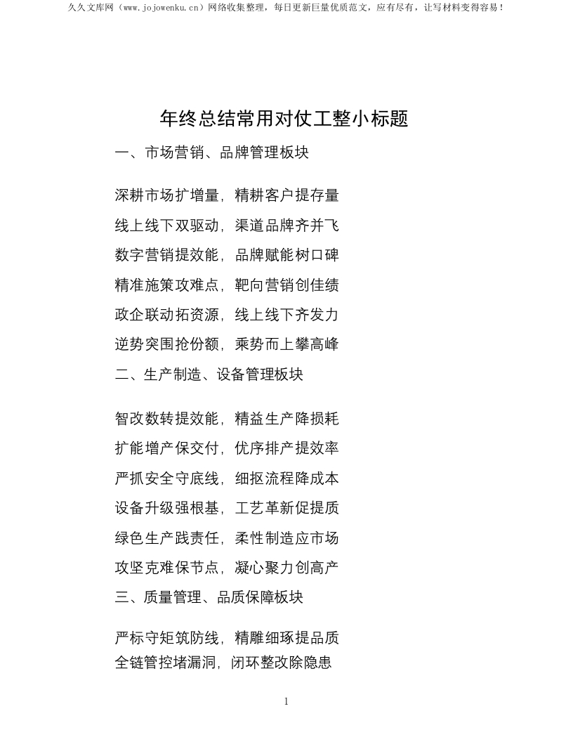 年终总结常用对仗工整小标题