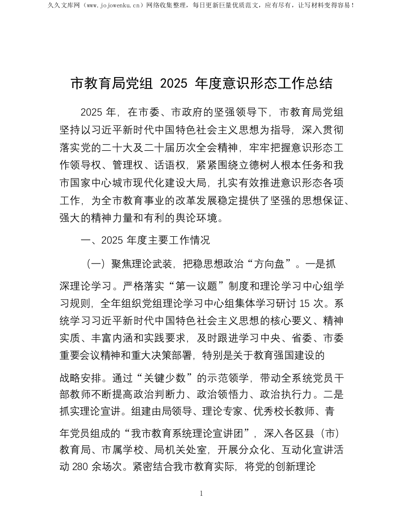 市教育局党组2025年度意识形态工作总结