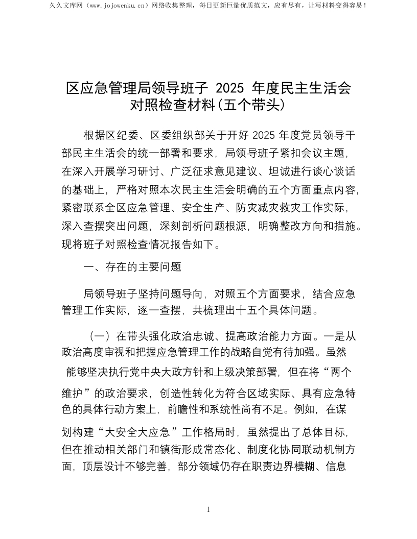 区应急管理局领导班子2025年度民主生活会对照检查材料(五个带头)