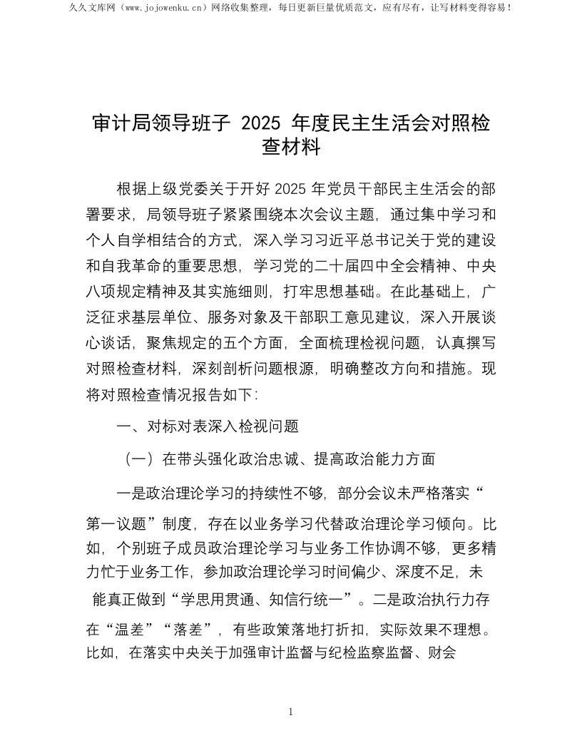 审计局领导班子2025年度民主生活会对照检查材料