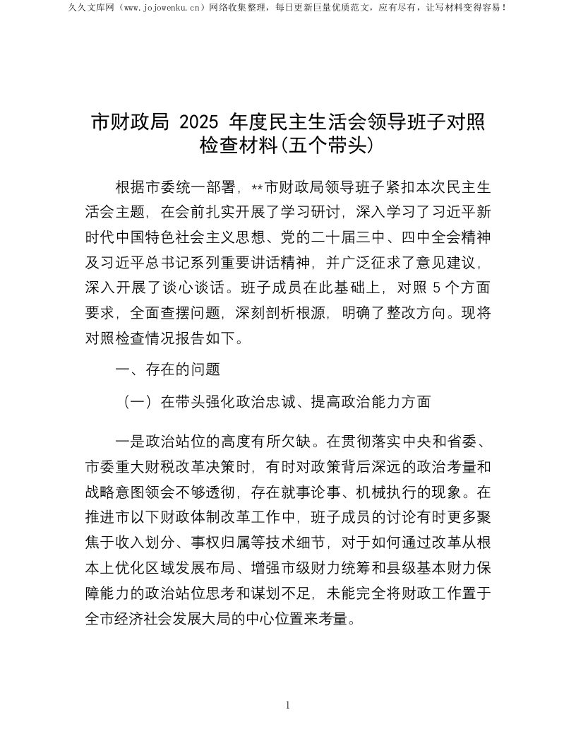 市财政局2025年度民主生活会领导班子对照检查材料(五个带头)
