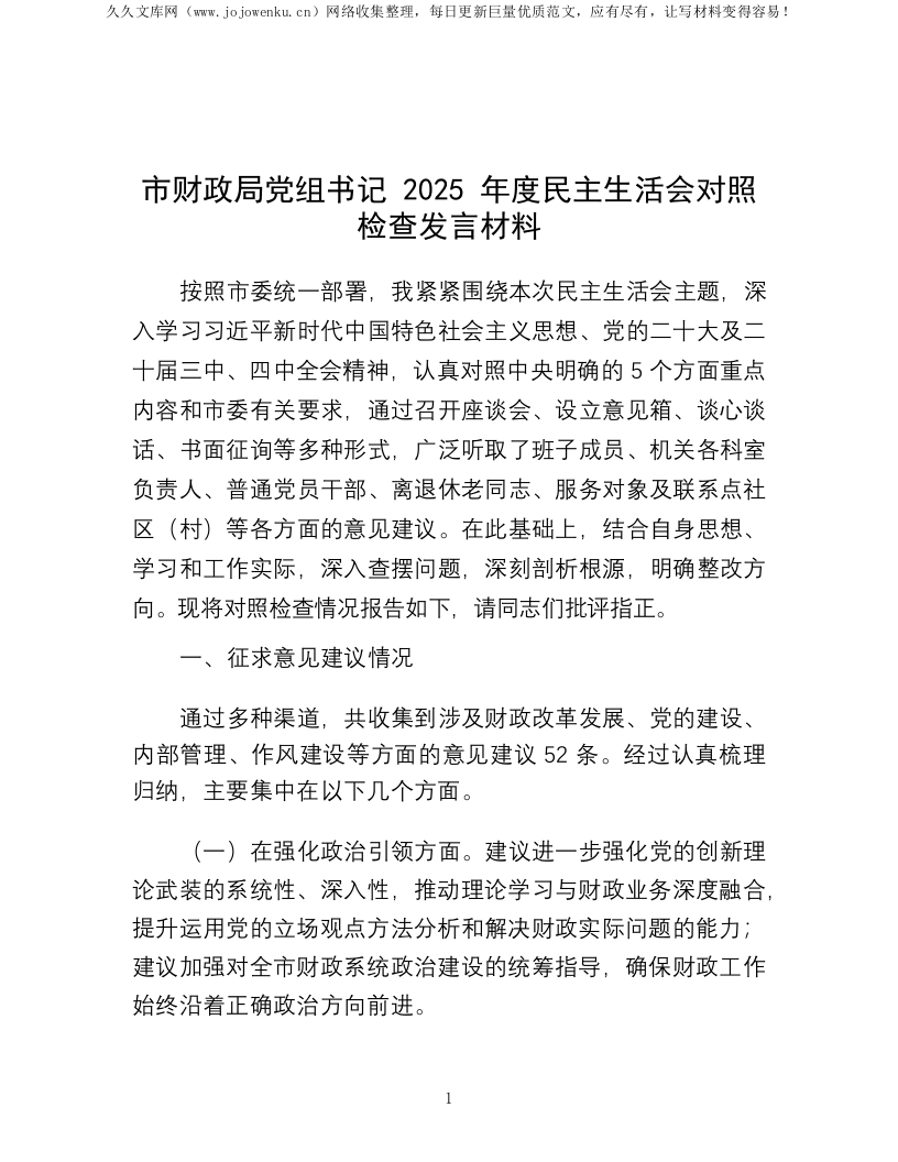 市财政局党组书记2025年度民主生活会对照检查发言材料