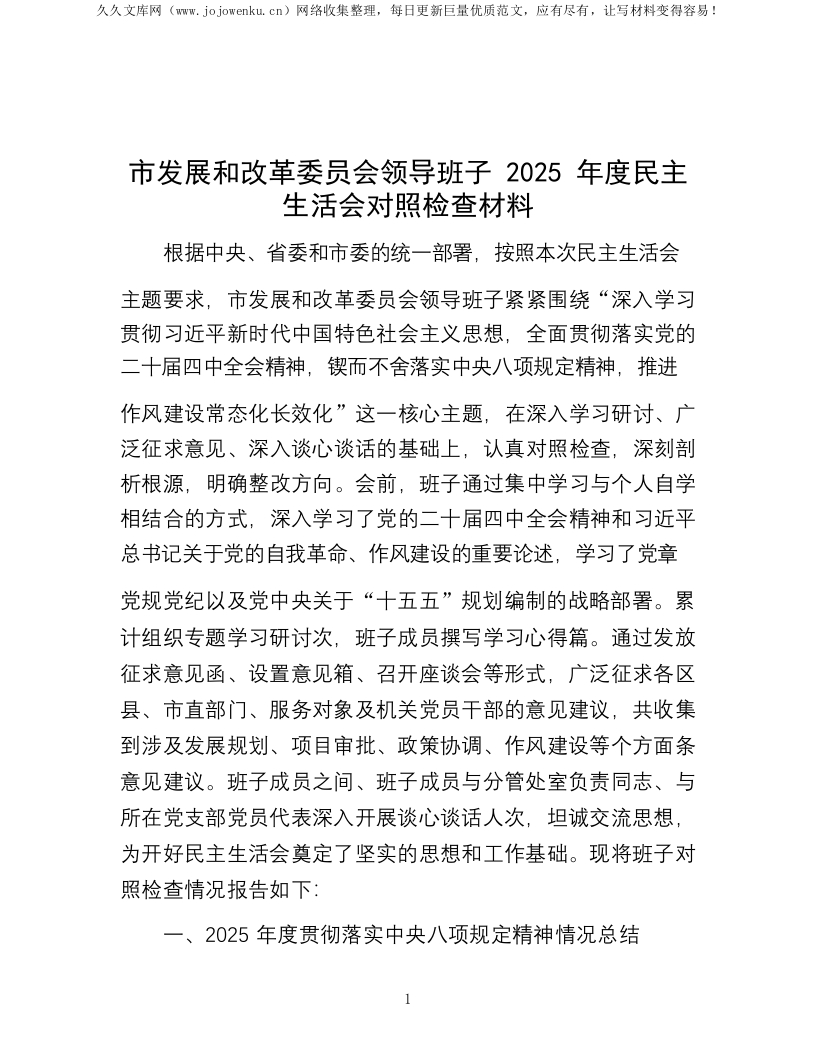 市发展和改革委员会领导班子2025年度民主生活会对照检查材料