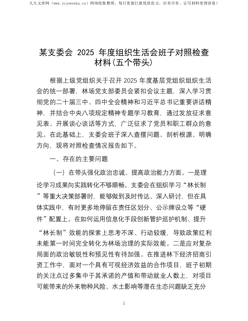 首页公文大全组织生活会某支委会2025年度组织生活会班子对照检查材料(五个带头)