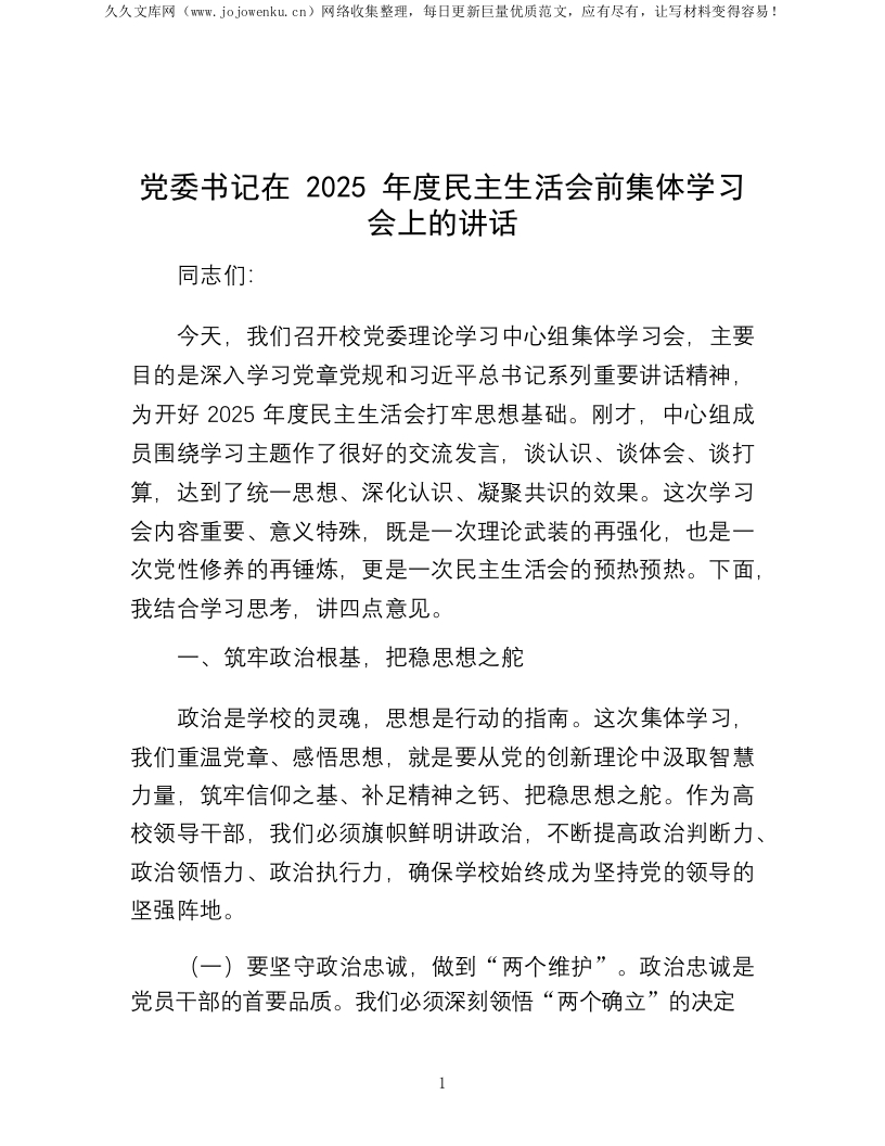 党委书记在2025年度民主生活会前集体学习会上的讲话