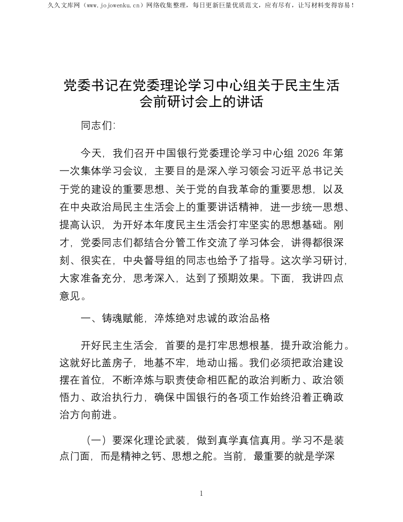 党委书记在党委理论学习中心组关于民主生活会前研讨会上的讲话