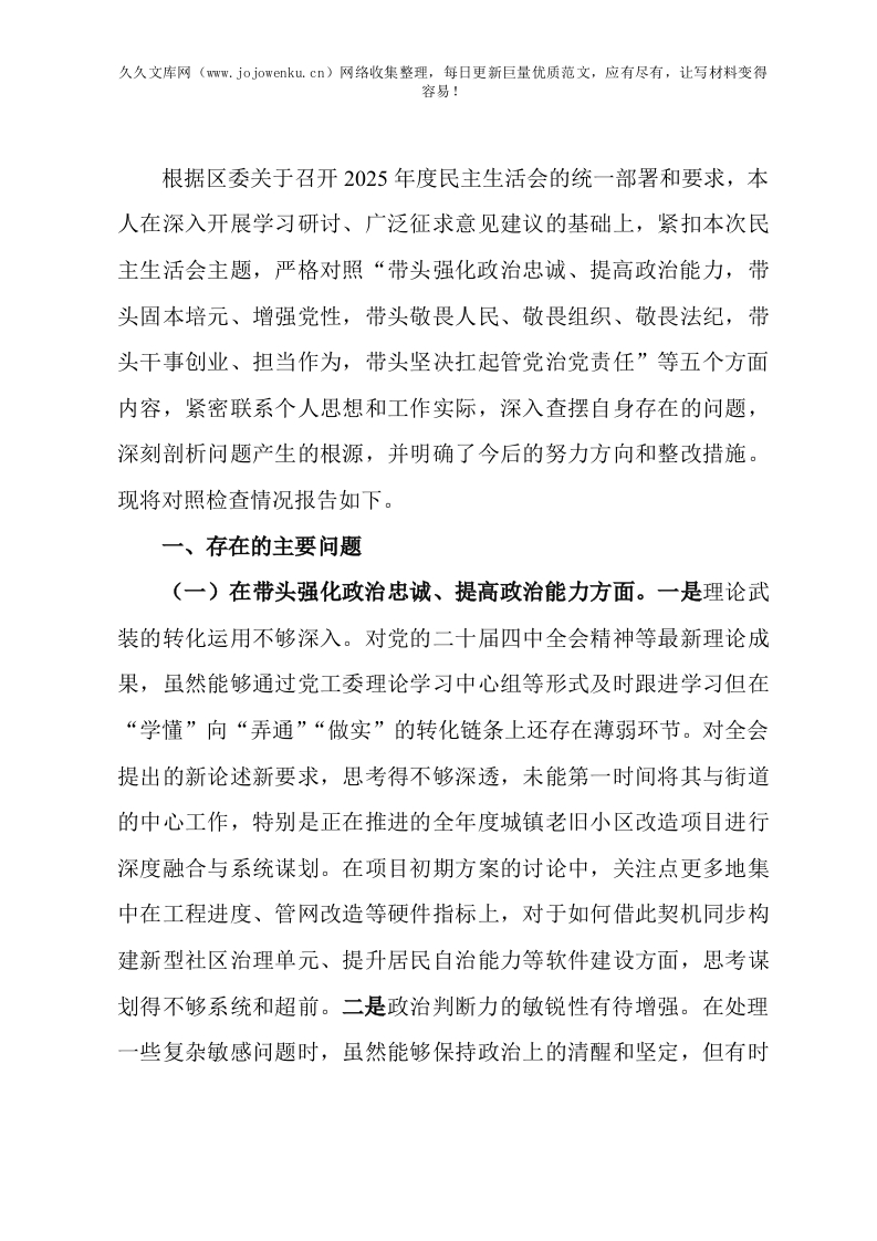 街道党工委武装部长2025年度民主生活会对照检查材料(五个带头)