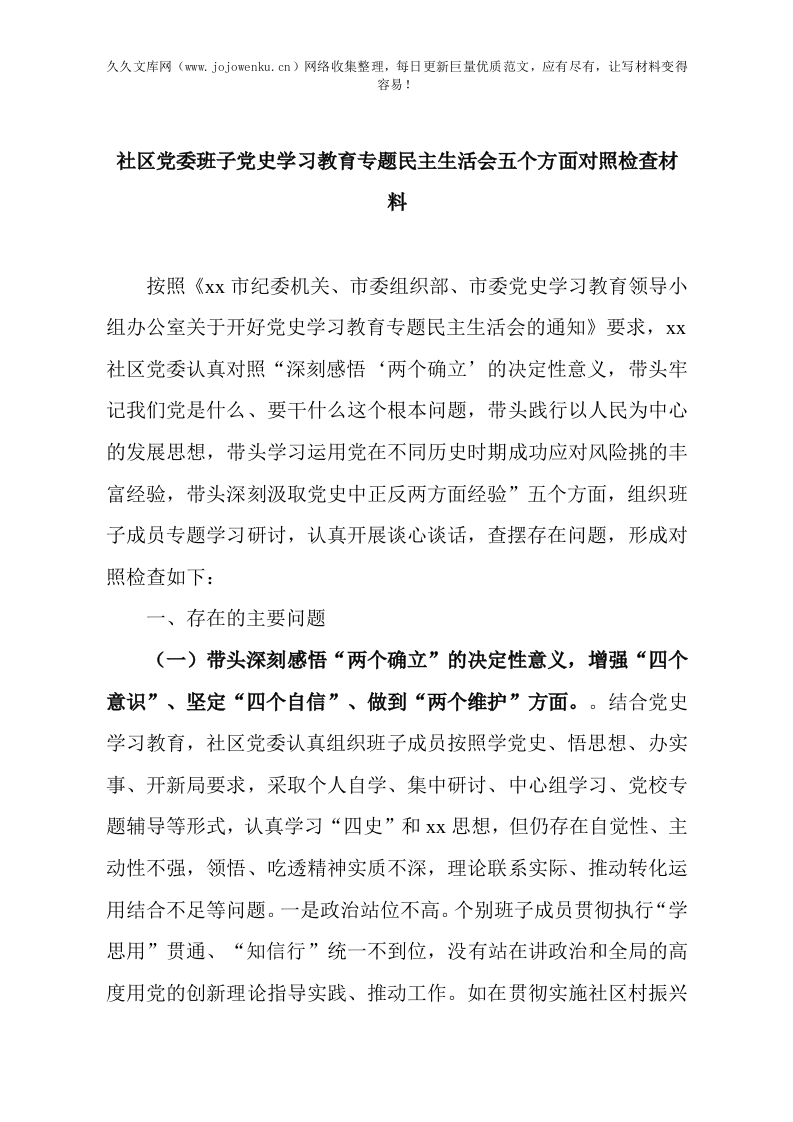 社区党委班子党史学习教育专题民主生活会五个方面对照检查材料