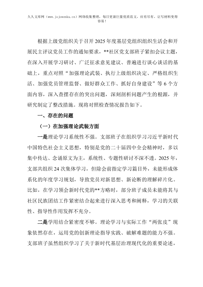 首页公文大全民主生活会社区党支部2025年组织生活会班子对照检查材料(六个对照)