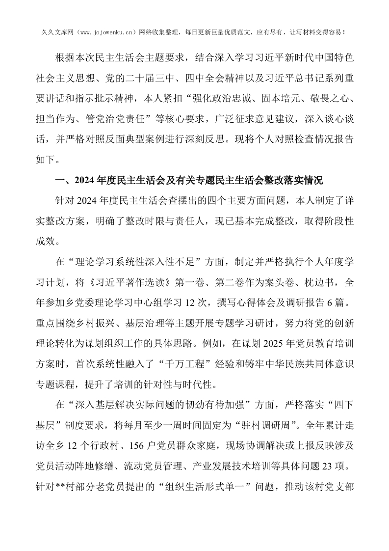乡党委组织委员2025年度民主生活会个人对照检查材料