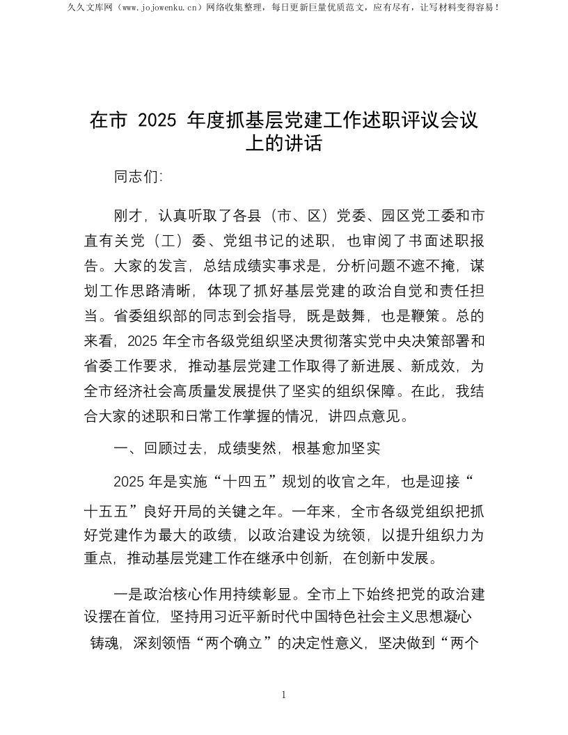 在市2025年度抓基层党建工作述职评议会议上的讲话