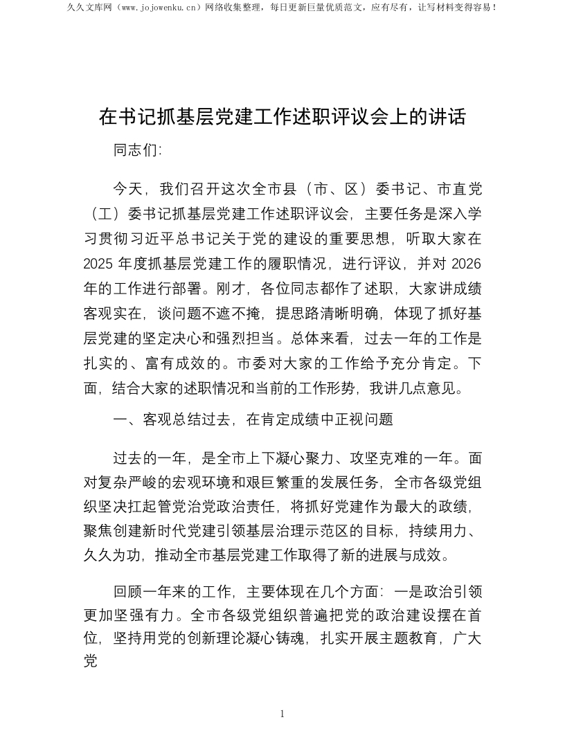 首页公文大全述职述廉在书记抓基层党建工作述职评议会上的讲话