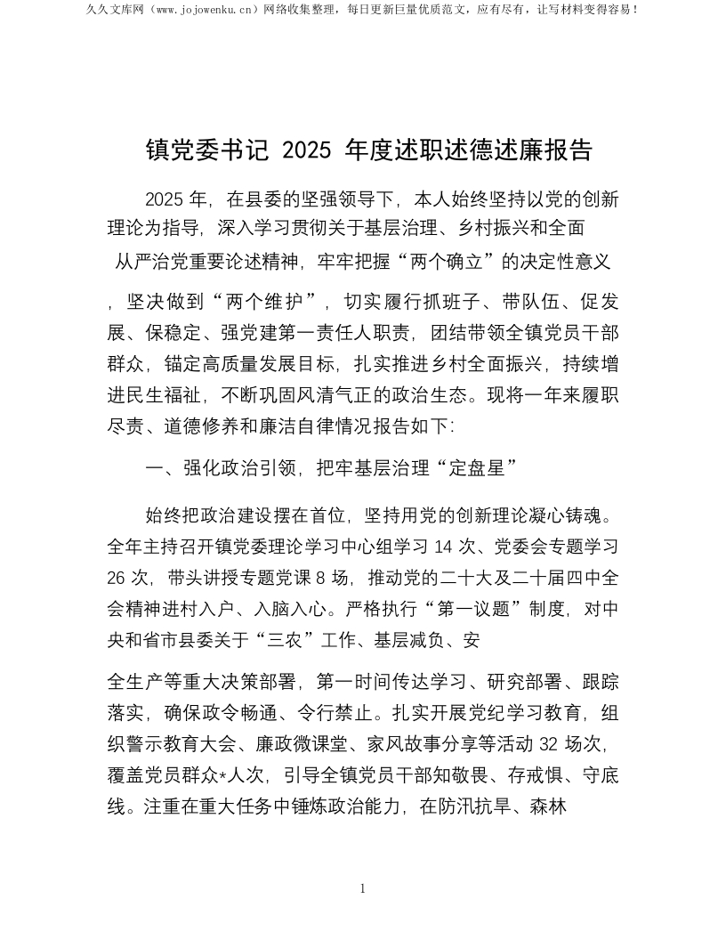 首页公文大全述职述廉镇党委书记2025年度述职述德述廉报告