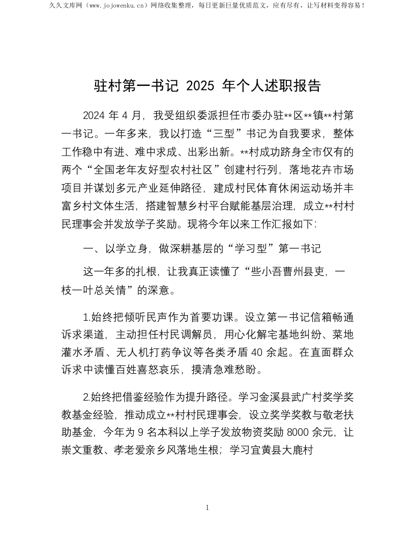 驻村第一书记2025年个人述职报告