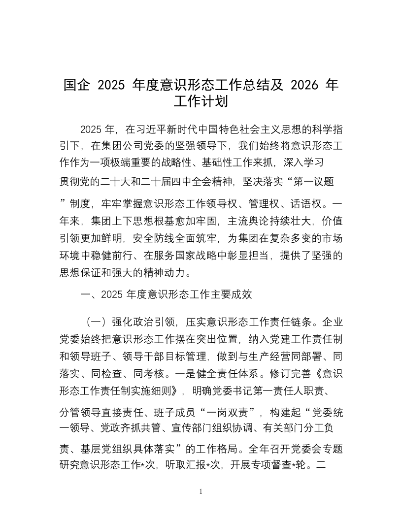 国企2025年度意识形态工作总结及2026年工作计划