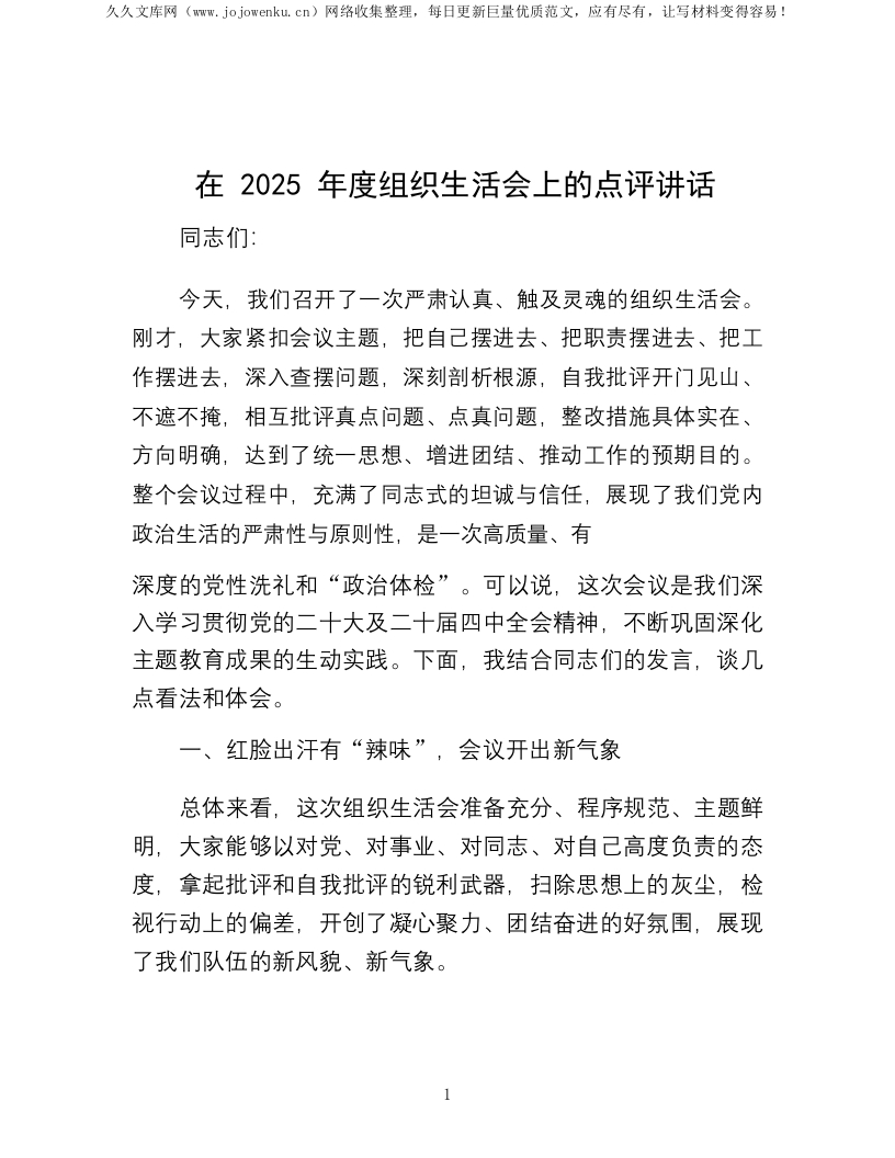 在2025年度组织生活会上的点评讲话