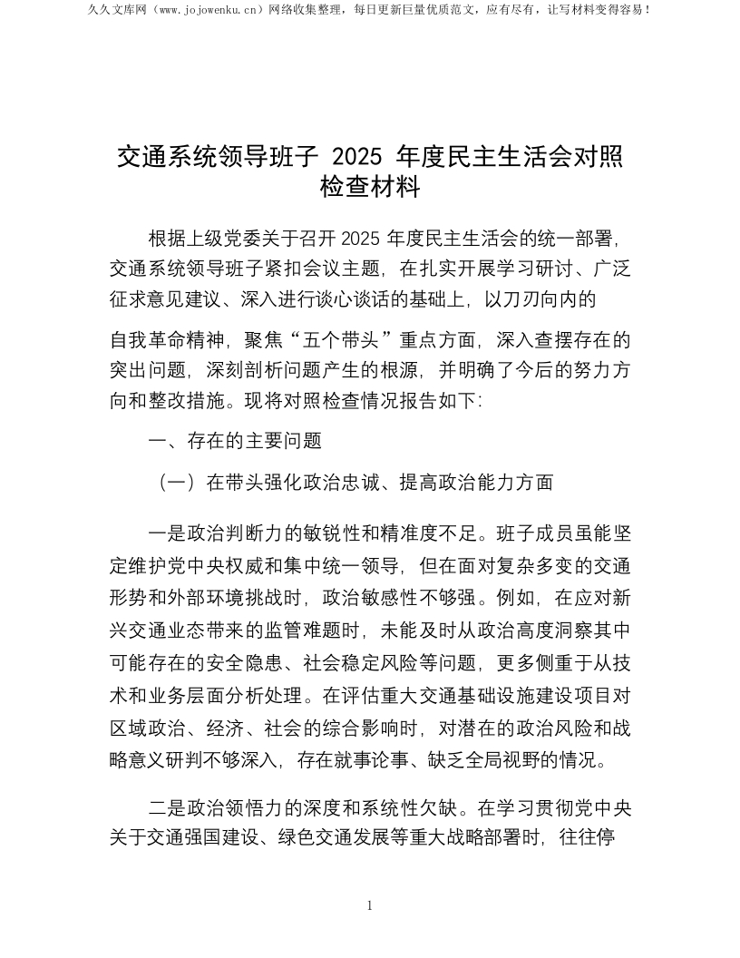 首页公文大全民主生活会交通系统领导班子2025年度民主生活会对照检查材料