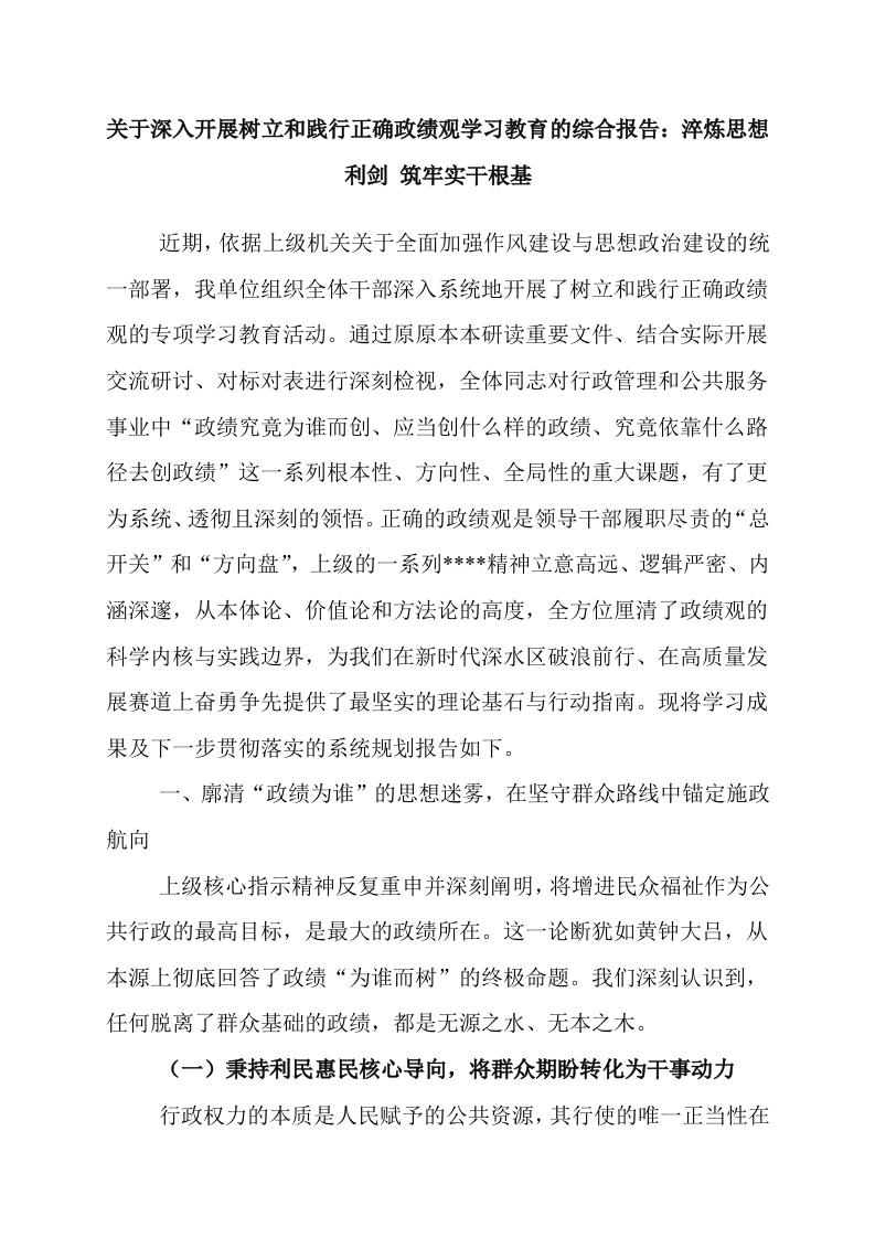 正确政绩观学习教育综合报告:淬炼思想利剑+筑牢实干根基