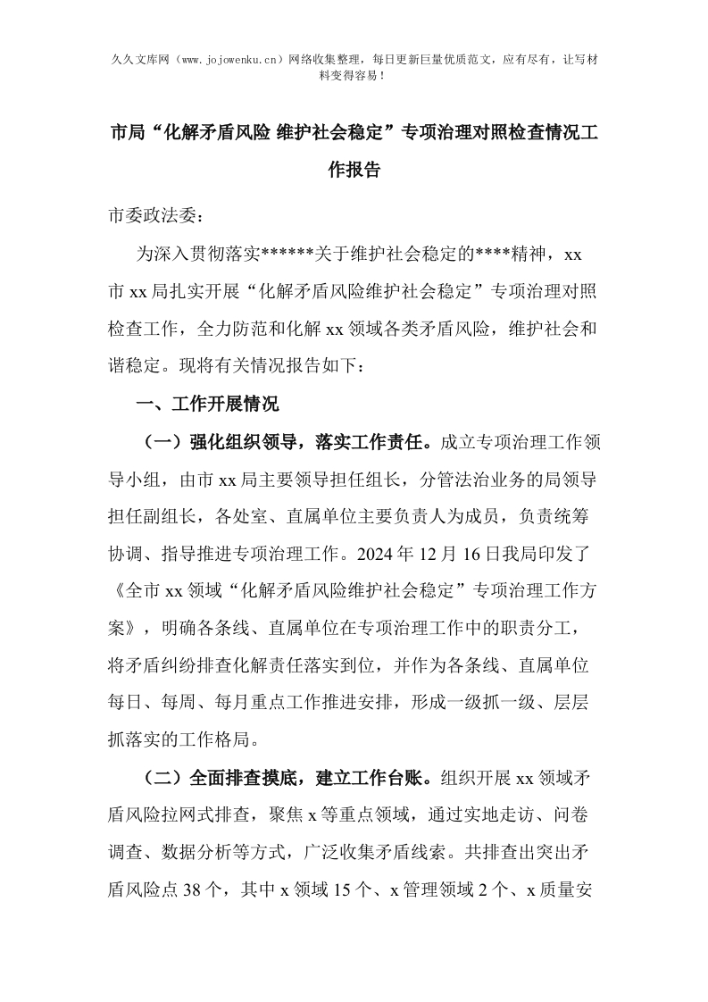 专项治理对照检查工作报告:市局“化解矛盾风险+维护社会稳定”专项治理对照检查情况工作报告