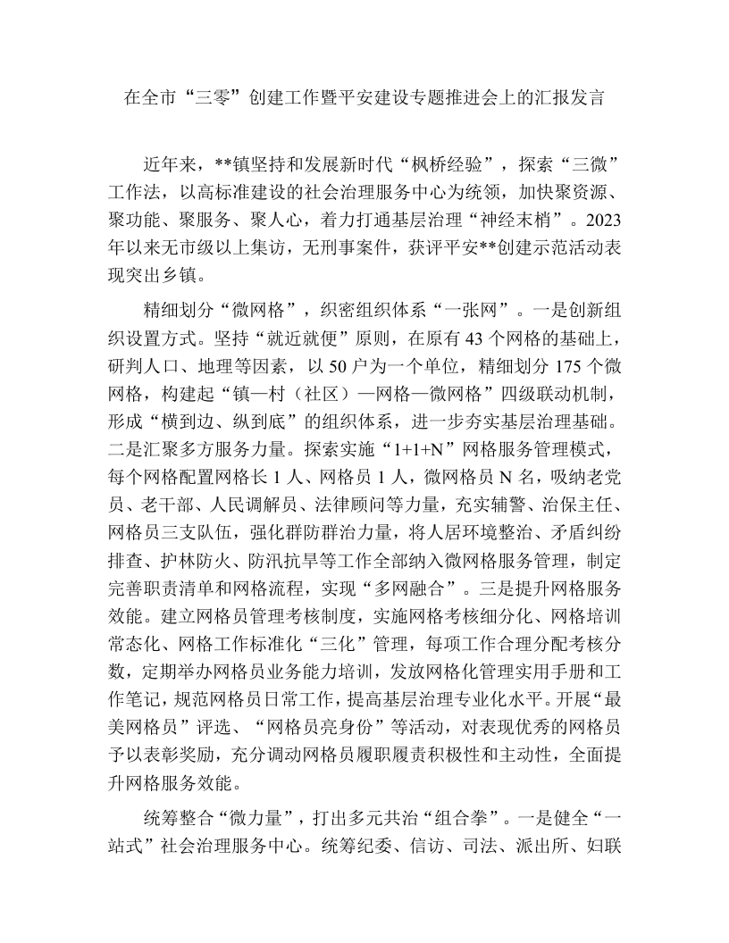 全市“三零”创建工作暨平安建设汇报发言:全市“三零”创建工作暨平安建设专题推进会上的汇报发言