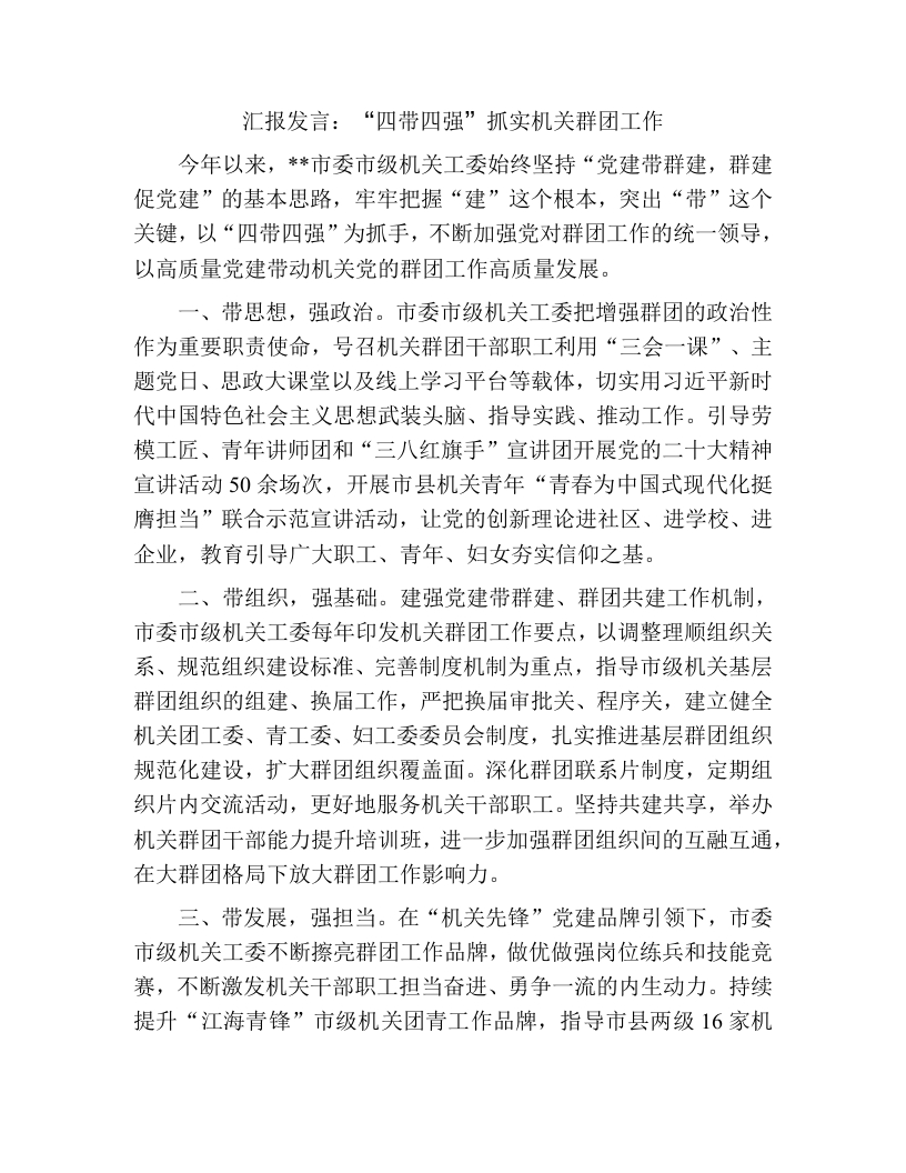 群团工作汇报发言:“四带四强”抓实机关群团工作