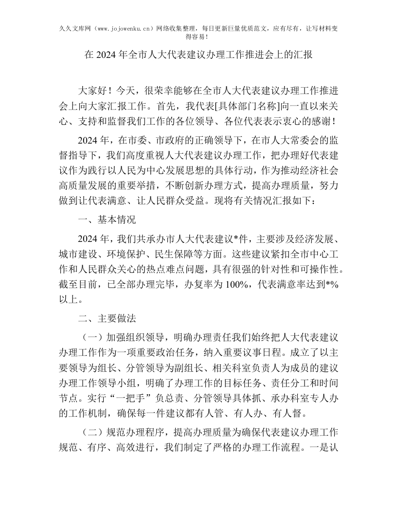 人大代表建议办理工作推进会汇报:在 2024 年全市人大代表建议办理工作推进会上的汇报