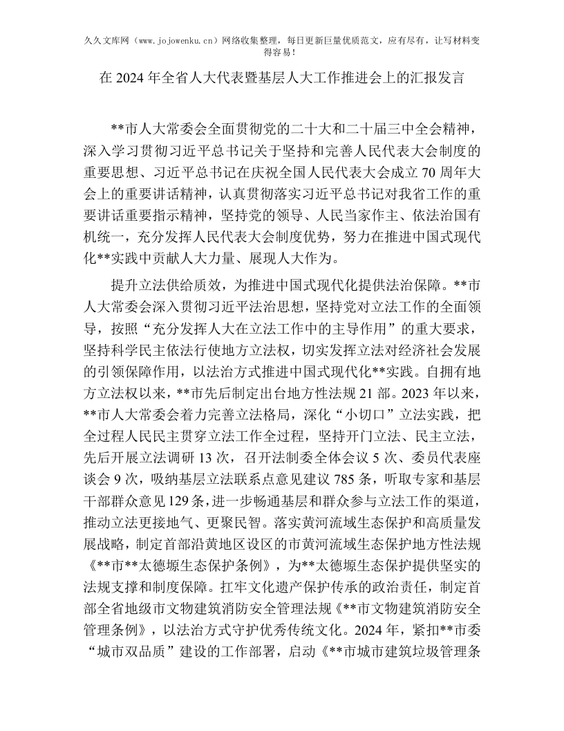 人大工作推进会汇报发言:在2024年全省人大代表暨基层人大工作推进会上的汇报发言