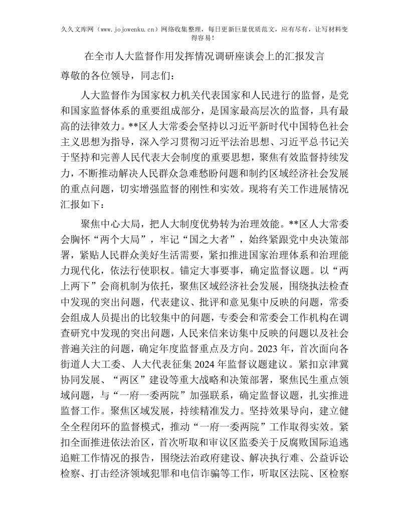 人大监督作用发挥调研汇报:全市人大监督作用发挥情况调研座谈会上的汇报发言