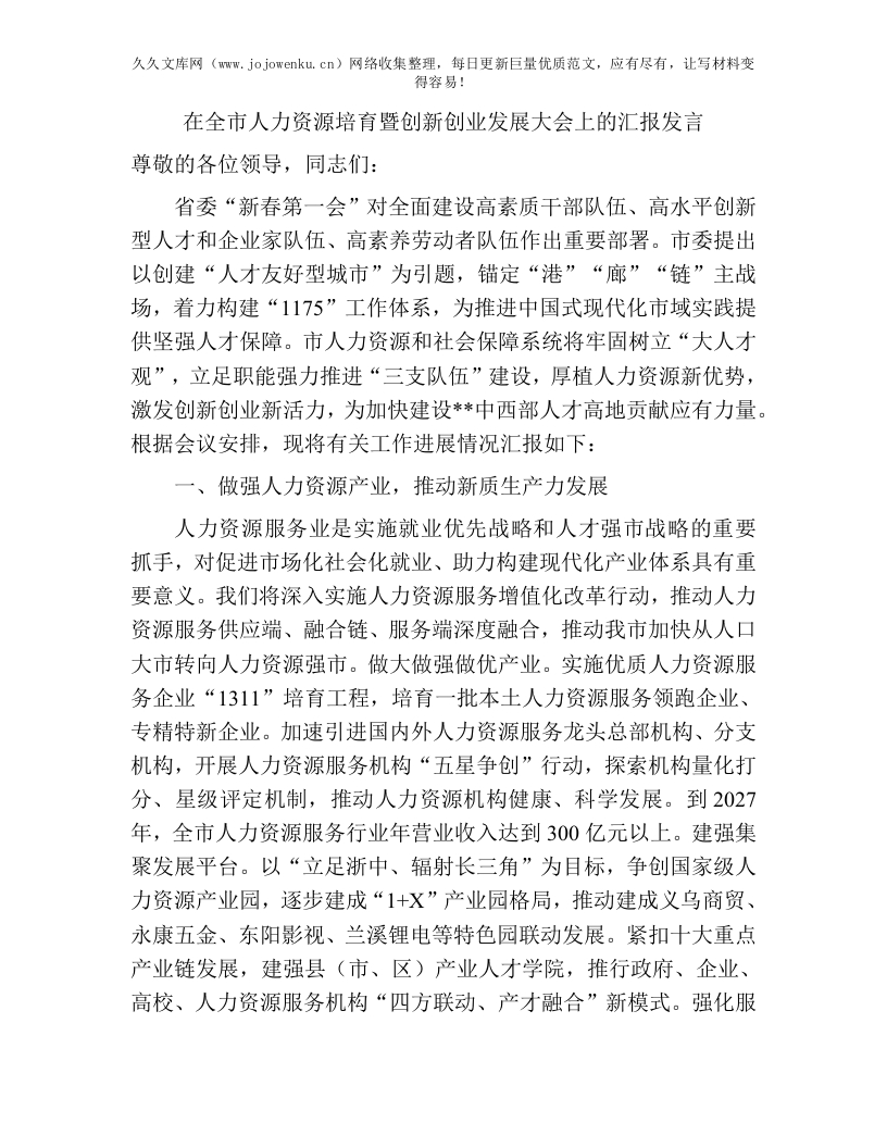 人力资源培育暨创新创业发展大会汇报:在全市人力资源培育暨创新创业发展大会上的汇报发言