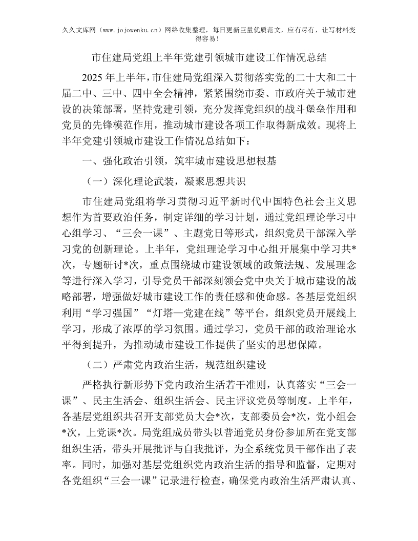上半年党建引领城市建设工作总结:市住建局党组上半年党建引领城市建设工作情况总结