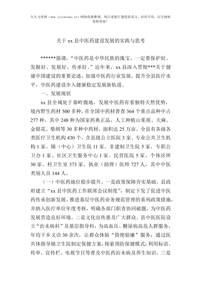 中医药建设发展实践与思考:关于XX县中医药建设发展的实践与思考