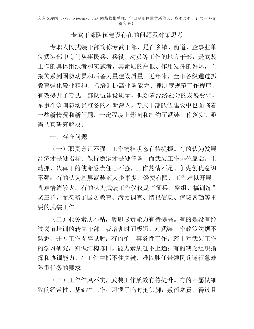 专武干部队伍建设存在的问题及对策思考:专武干部队伍建设存在的问题及对策思考