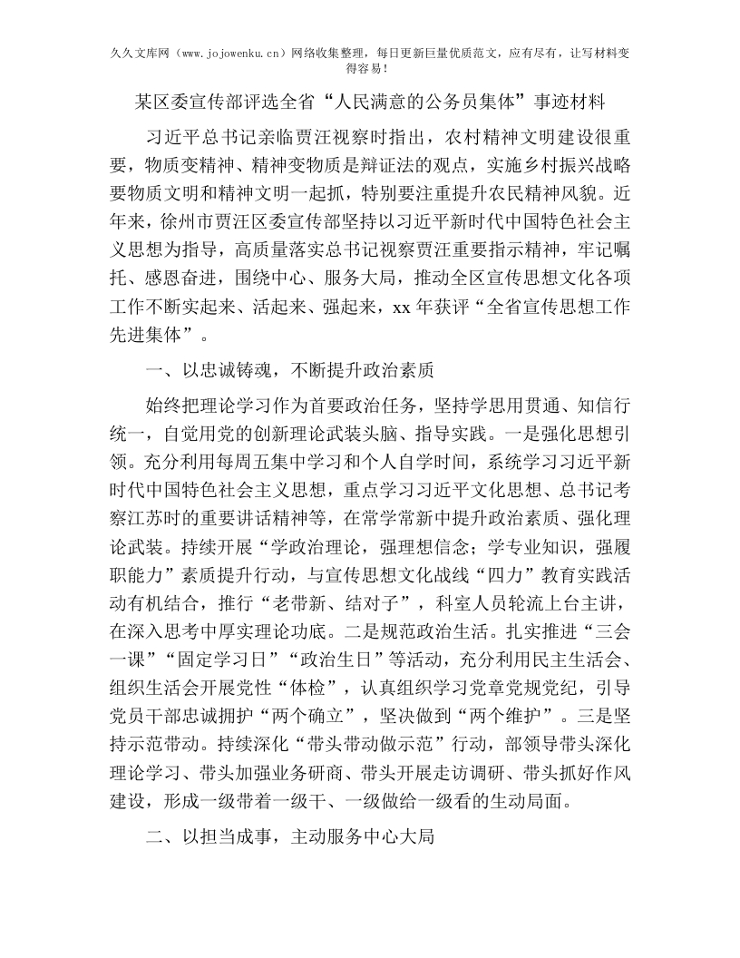 “人民满意公务员集体”评选事迹:某区委宣传部评选全省“人民满意的公务员集体”事迹材料