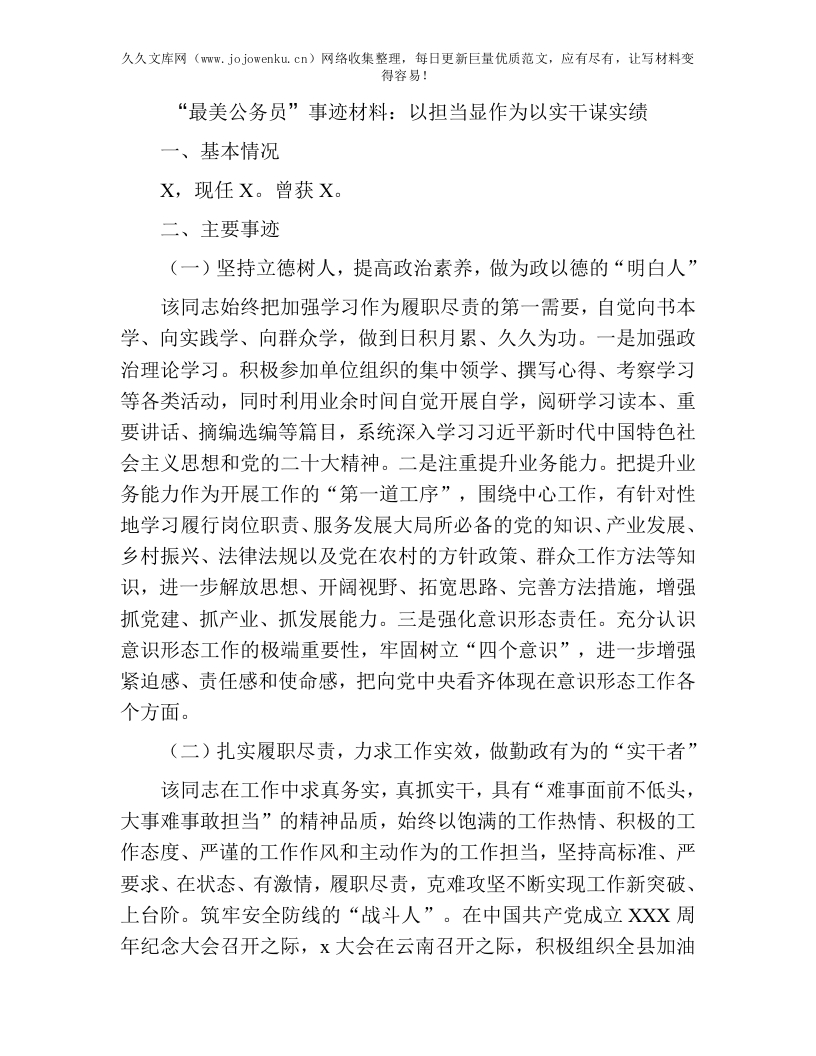 首页公文大全先进事迹“最美公务员”事迹材料:以担当显作为 以实干谋实绩
