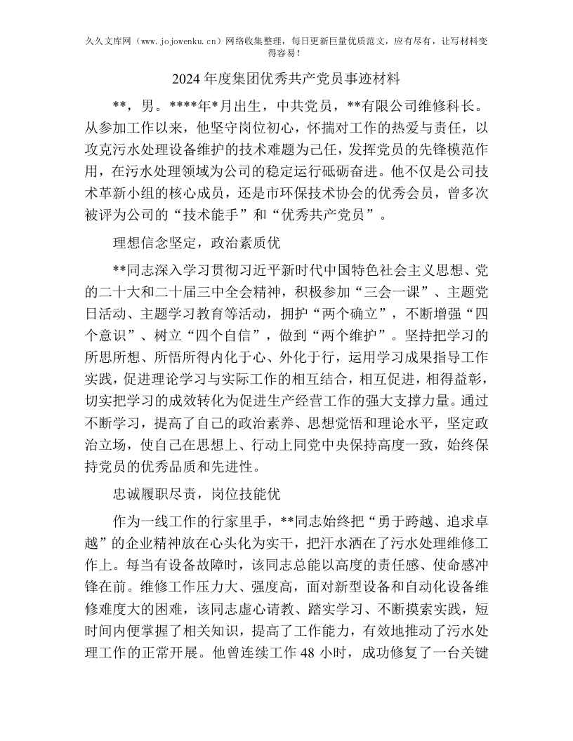 优秀共产党员事迹材料:2024年度集团优秀共产党员事迹材料