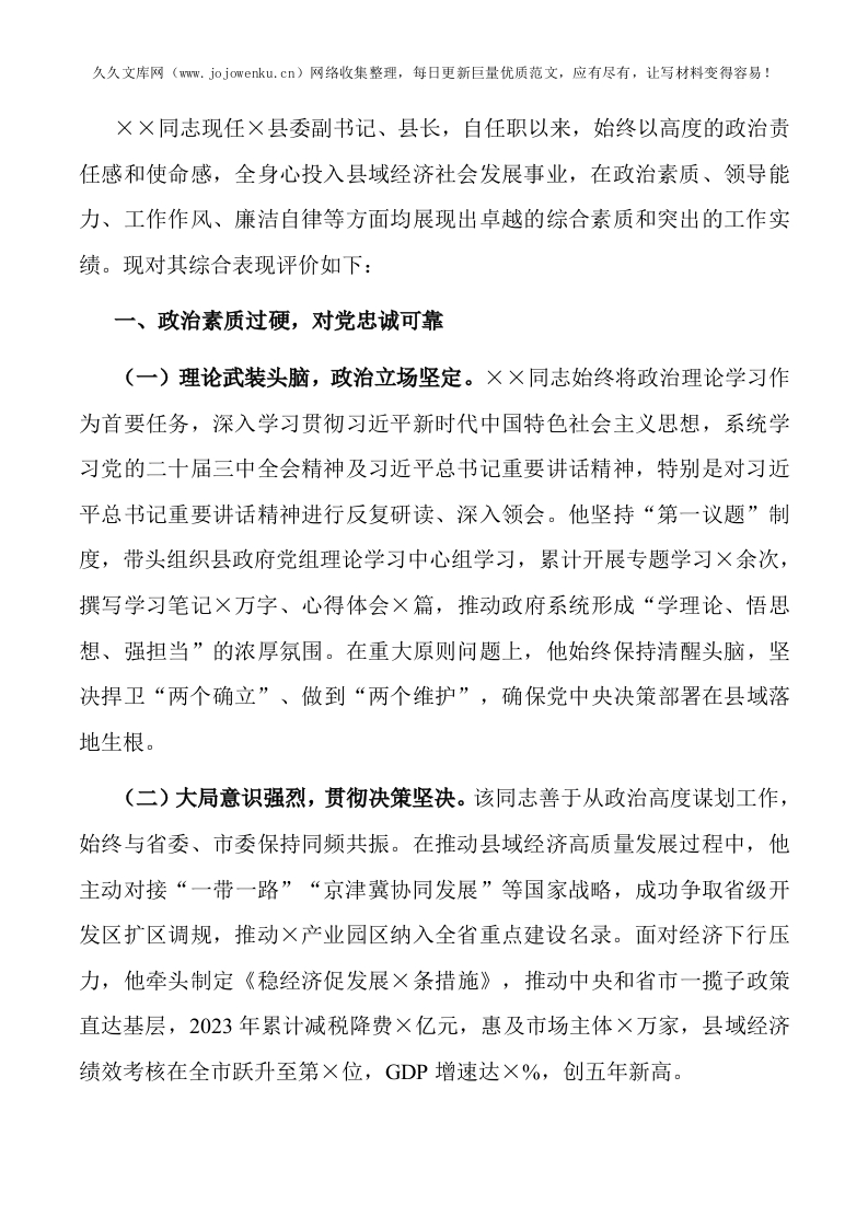 县委副书记、县长任职情况评价材料