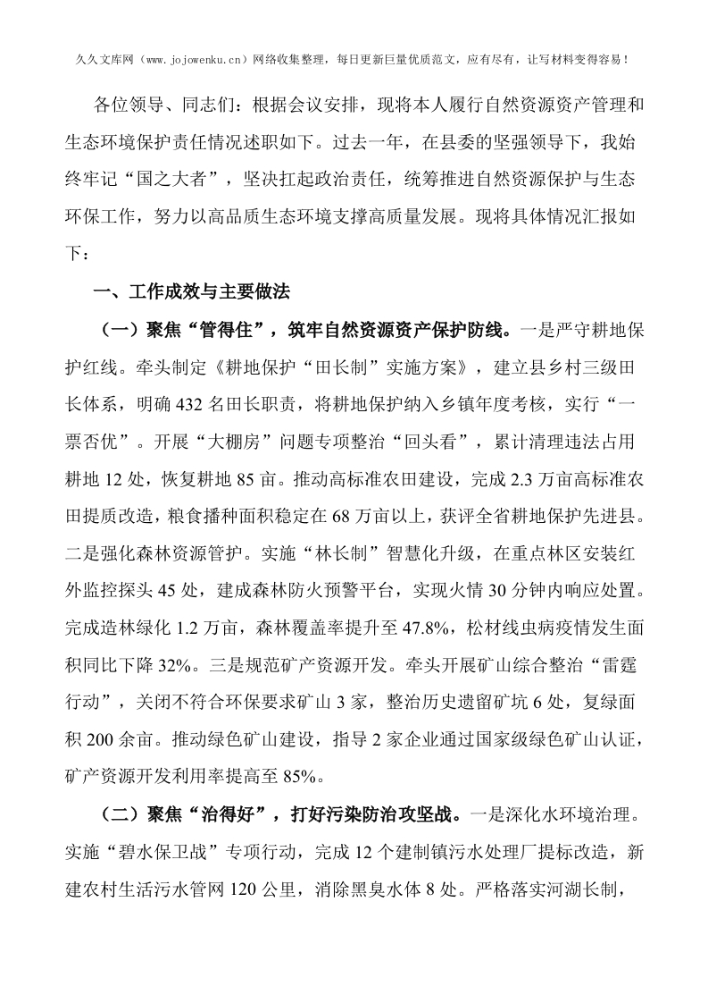 县委副书记履行自然资源资产管理和生态环境保护责任述职报告