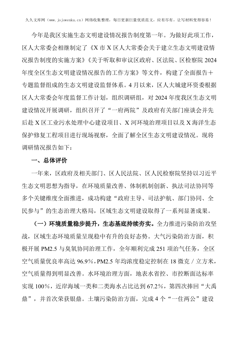 关于2024年度全区生态文明建设情况的调研报告