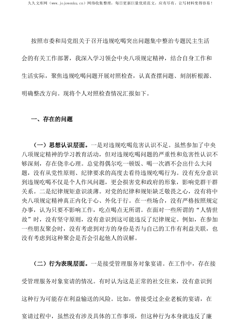 党员干部违规吃喝突出问题集中整治专题民主生活会对照检查材料
