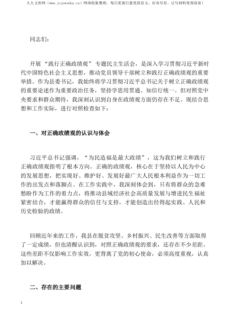 县委书记在 “践行正确政绩观” 专题民主生活会上的对照检查材料