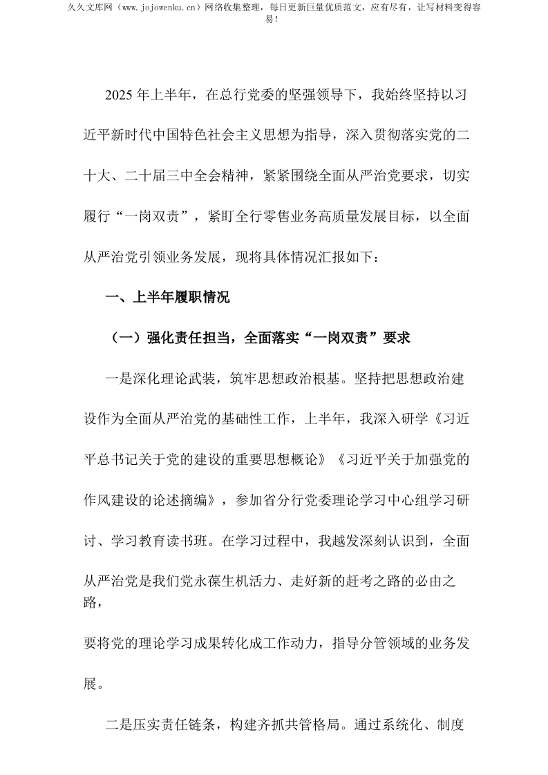 首页公文大全总结报告汇报银行副行长2025年上半年履行全面从严治党一岗双责汇报材料