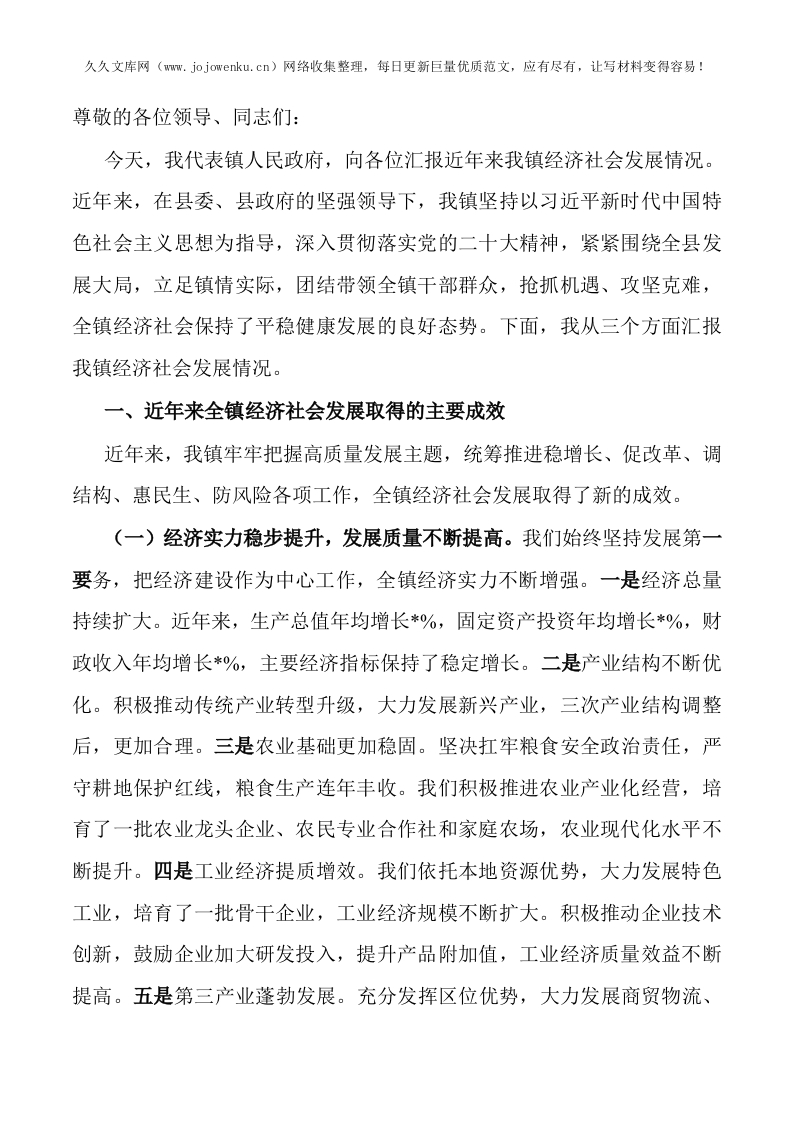 镇政府关于经济社会发展情况的汇报材料